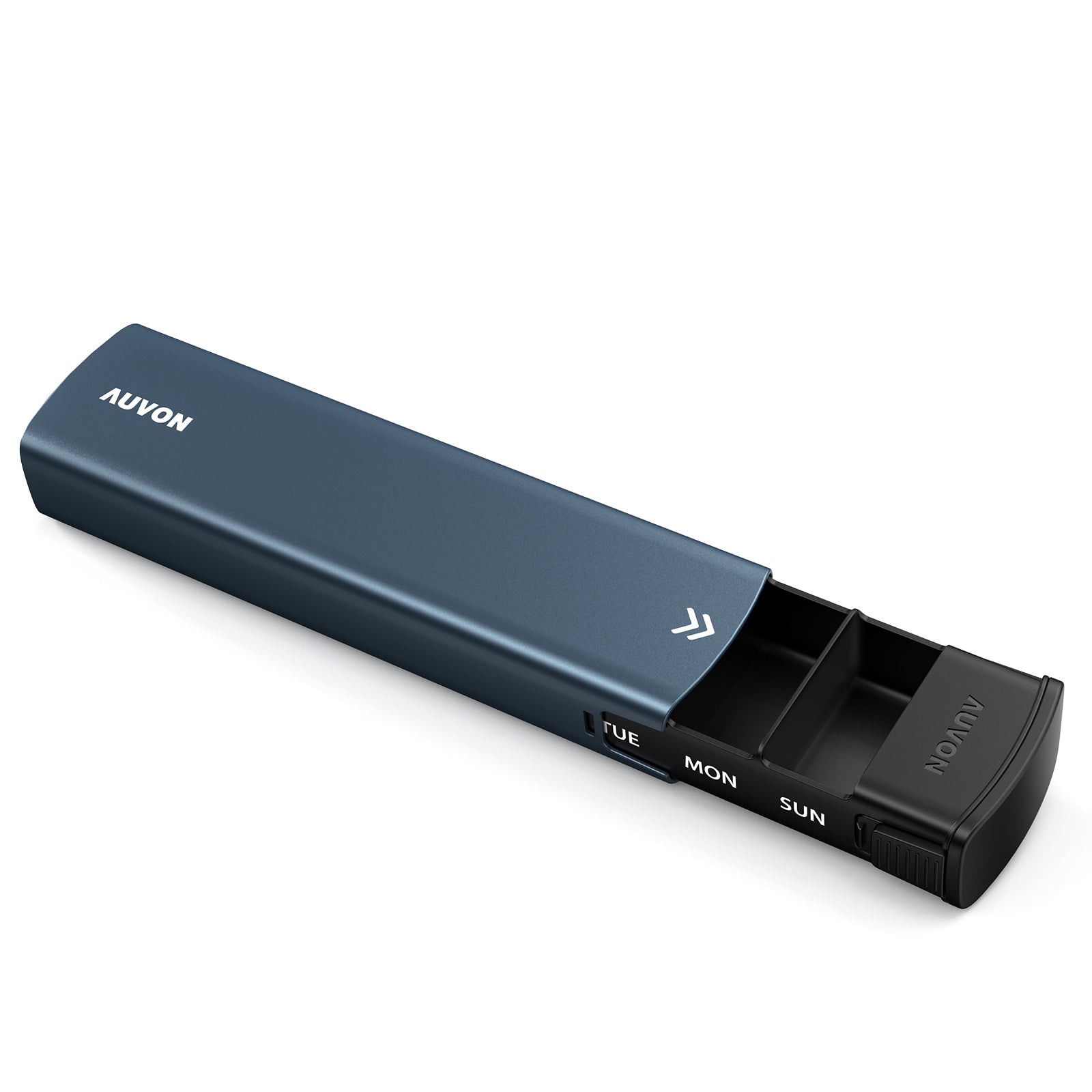 AUVON Metal Weekly Pill Organizer with Slide Design, Stylish Travel Pill Box 7 Day for Privacy Protection, Aluminum Alloy Pill Case with Large Compartment for Supplements, Fish Oil (Dark Blue)